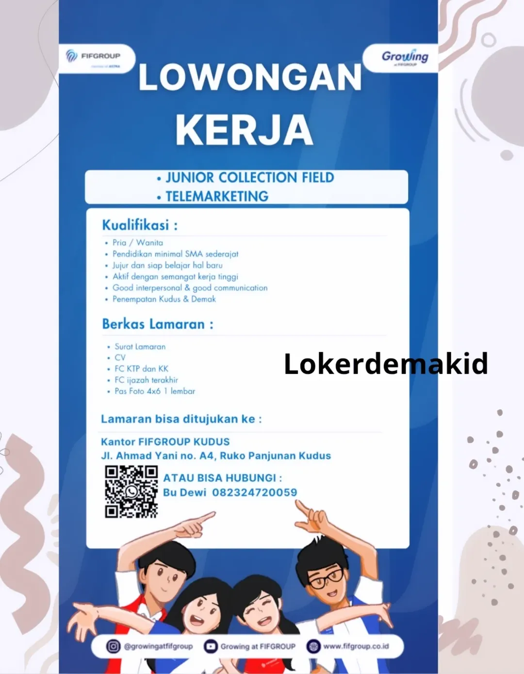 KUDUS/DEMAK โ Kabar baik bagi para pencari kerja di wilayah Kudus dan Demak. FIFGROUP kembali membuka kesempatan berkarier melalui program โGrowing at FIFGROUPโ dengan posisi yang tersedia yaitu Junior Collection Field dan Telemarketing.