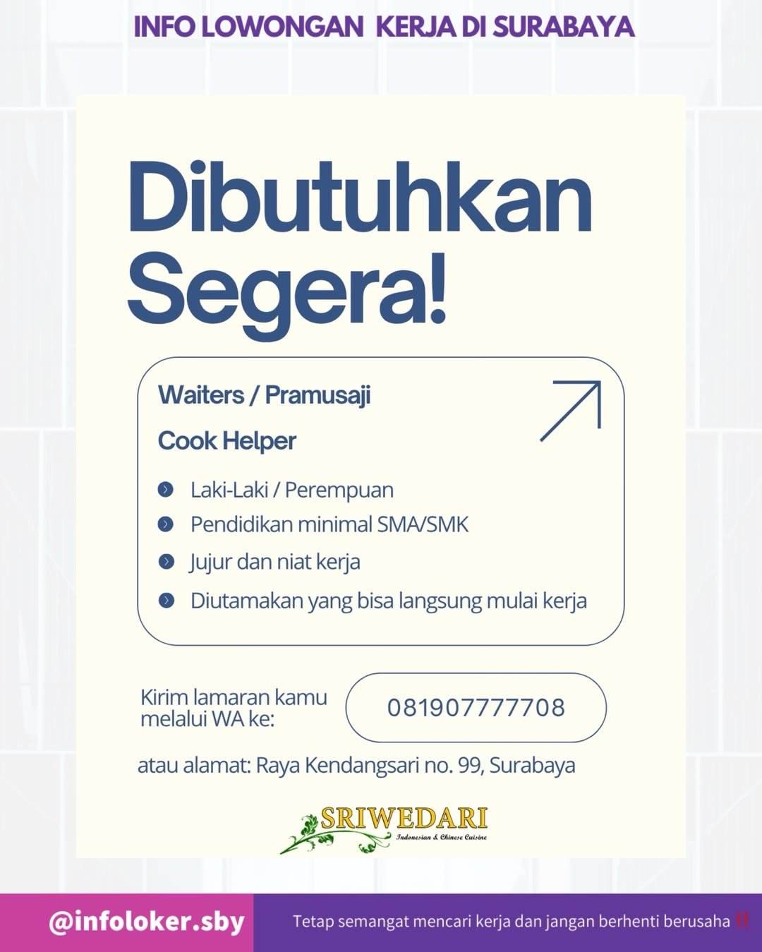 INFO LOWONGAN KERJA DI SURABAYA: Sriwedari Buka Rekrutmen Waiters dan Cook Helper