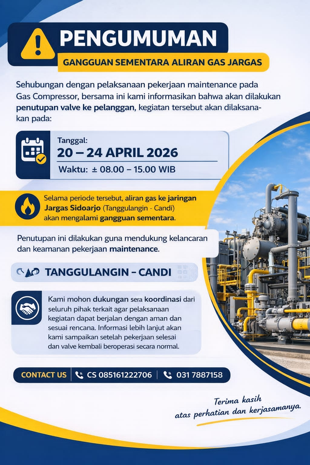 SIDOARJO,JADIKABAR.COM – Warga di wilayah Kecamatan Candi dan Tanggulangin, Kabupaten Sidoarjo, diimbau untuk bersiap menghadapi gangguan sementara aliran gas jaringan (jargas) selama beberapa hari ke depan. Gangguan ini terjadi seiring adanya pekerjaan pemeliharaan (maintenance) pada fasilitas gas compressor yang dilakukan oleh pihak terkait.