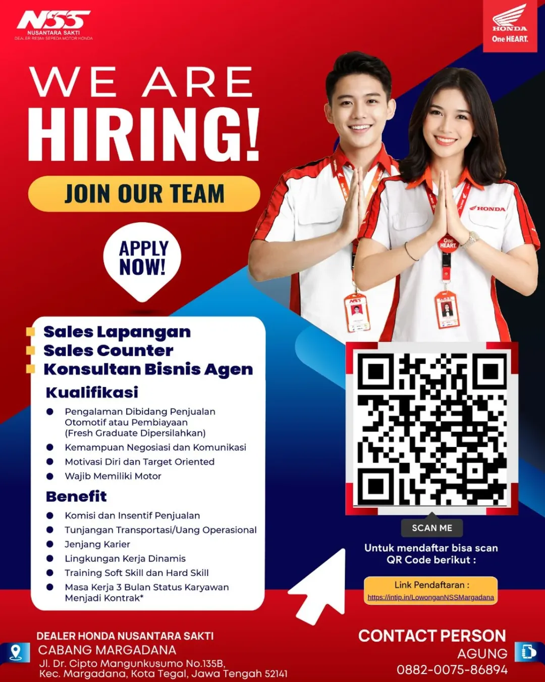 Kabar baik bagi para pencari kerja, khususnya yang tertarik di bidang penjualan dan otomotif. Dealer Honda Nusantara Sakti Cabang Margadana, Tegal, saat ini membuka lowongan kerja untuk beberapa posisi sekaligus.