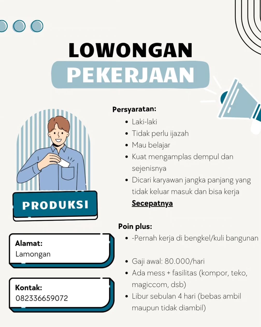 Kabar.com β Sebuah peluang kerja terbuka bagi masyarakat yang sedang mencari pekerjaan di bidang produksi. Lowongan ini ditujukan khusus bagi tenaga kerja laki-laki yang siap bekerja dan memiliki kemauan untuk belajar.