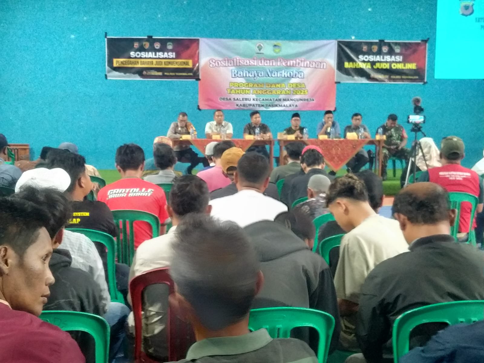 Kabupaten Tasikmalaya, JadiKabar.Com– Pemerintah Desa (Pemdes) Salebu, Kecamatan Mangunreja, Kabupaten Tasikmalaya menggelar kegiatan sosialisasi dan pembinaan bahaya narkoba serta bahaya judi online (judol). Acara tersebut berlangsung di GOR Desa Salebu pada Jumat (14/11/2025) dan dihadiri unsur Muspika, tokoh agama, tokoh masyarakat, serta tamu undangan lainnya.