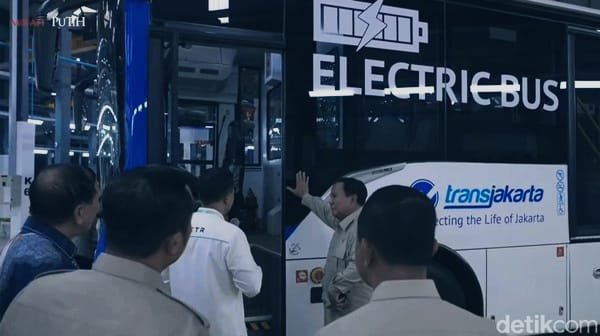 Di dalam gedung pabrik, sejumlah unit kendaraan listrik dipamerkan, termasuk bus listrik yang telah dirancang untuk kebutuhan transportasi publik Transjakarta. Presiden tampak meninjau secara langsung kondisi bus tersebut, mulai dari bagian eksterior hingga interior, serta sempat mencoba duduk di kursi penumpang.
