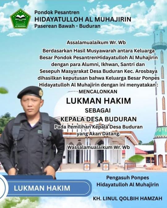 Poster tersebut menampilkan dukungan langsung dari Pondok Pesantren Hidayatulloh Al Muhajirin terhadap beberapa figur untuk maju sebagai calon Kades di beberapa desa, termasuk Batonaong, Arosbaya, Lajing, Buduran, dan Tengket Jum’at (12/12/2025).