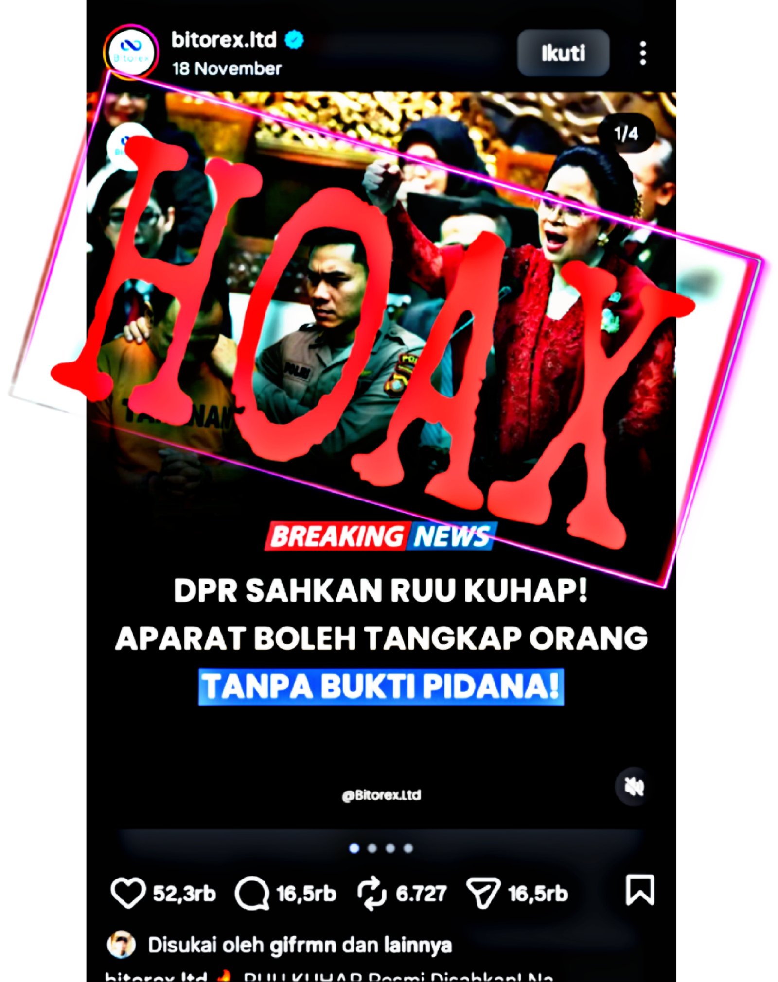 ” APARAT BOLEH TANGKAP ORANG TANPA BUKTI PIDANA ” seperti salah satunya yang diposting oleh akun Instagram @bitorex.ltd.